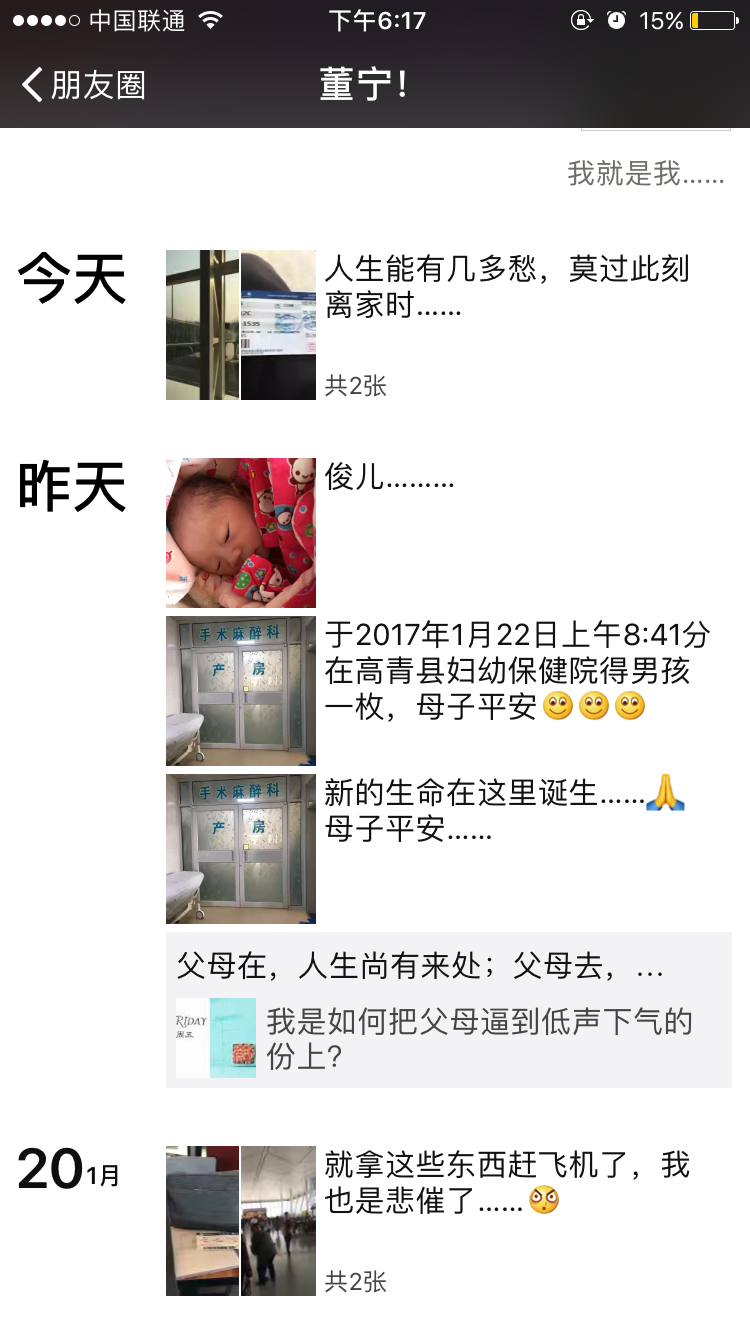 這張圖片是財務(wù)部駐貴州項目部會計董寧的朋友圈截圖。2017年1月22日農(nóng)歷臘月二十五,董寧的第二個小寶貝誕生,作為人夫、人父我想那一刻的喜悅已經(jīng)難以用語言來形容。但財務(wù)工作越到年底越緊亦是必然,所以短暫的陪伴過后董寧便又搭乘了前往貴州的航班,我們知道是財務(wù)人員的責任感讓他做出了這個選擇。“人生能有幾多愁,莫過此刻離家時”......縱然心中有萬般不舍,可魯中公路財務(wù)人的擔當再次讓他義無反顧的前往了項目工地。