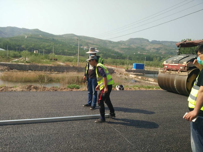 南崔路瀝青攤鋪現(xiàn)場(chǎng),施工員焦守強(qiáng)跟機(jī)檢測(cè)。