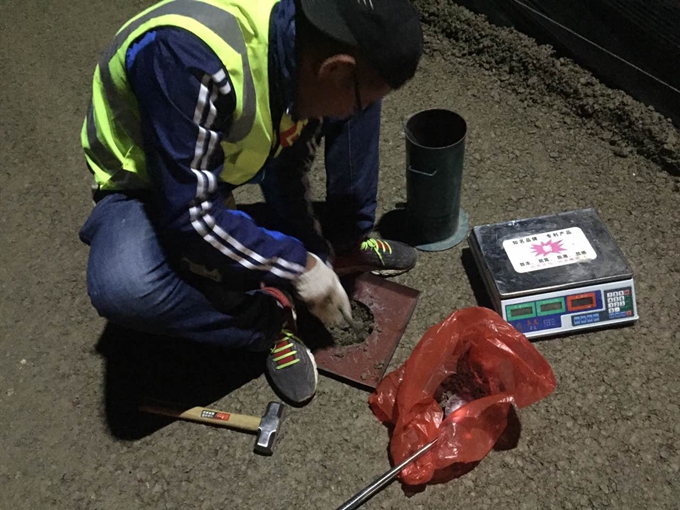南崔路,實(shí)驗(yàn)員就新鋪路面進(jìn)行就地取樣并檢測(cè)。