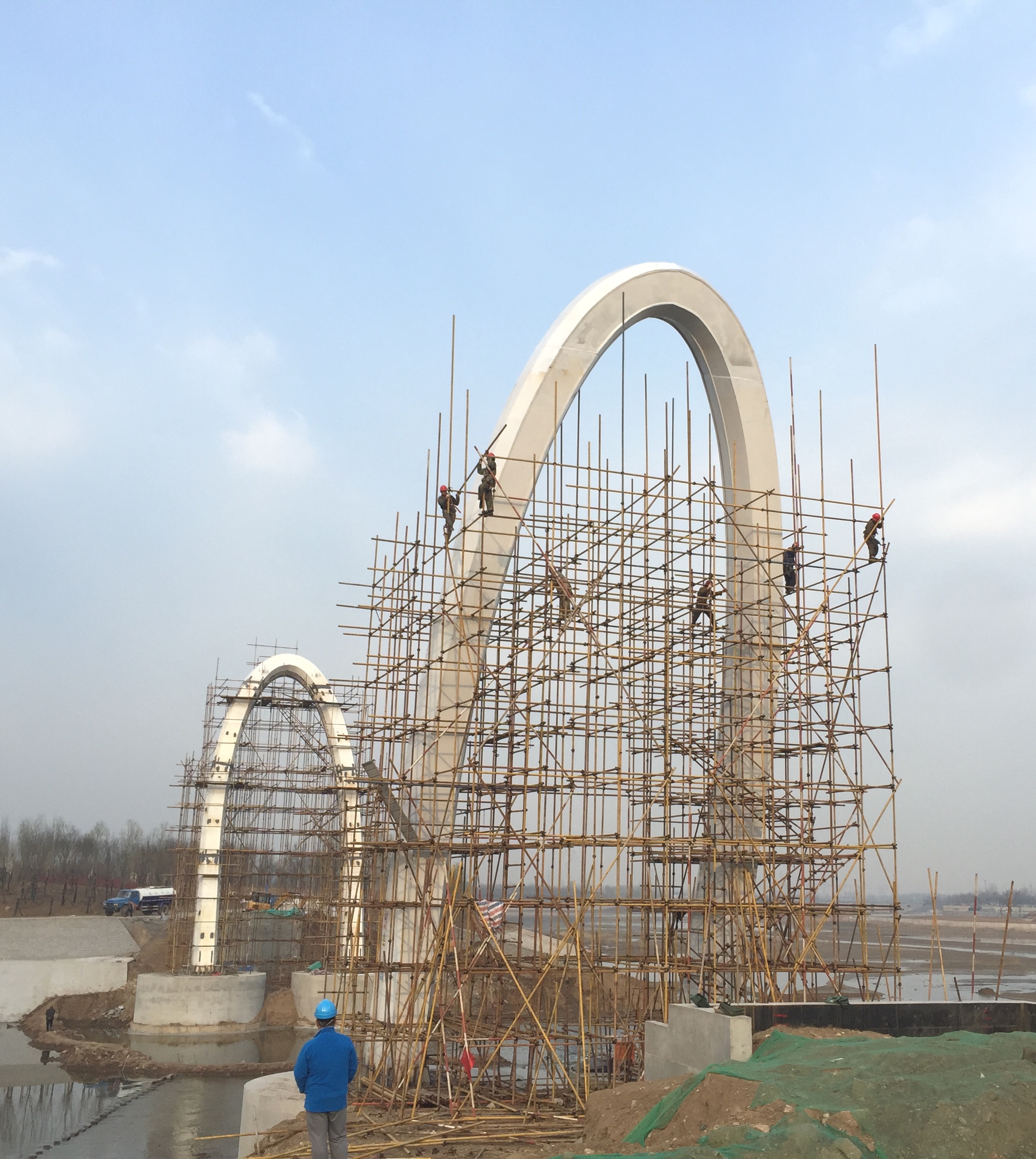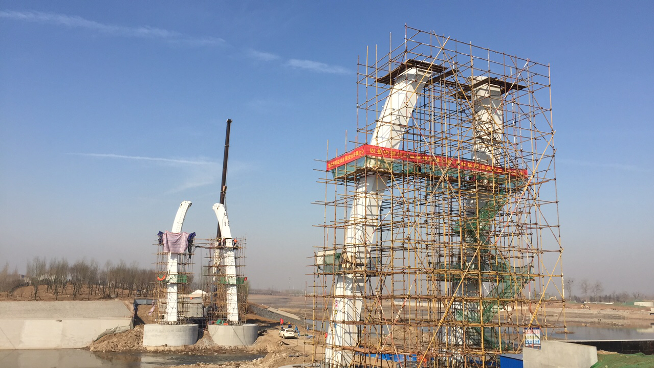 2017年2月28日,鋼主塔施工搭設腳手架。