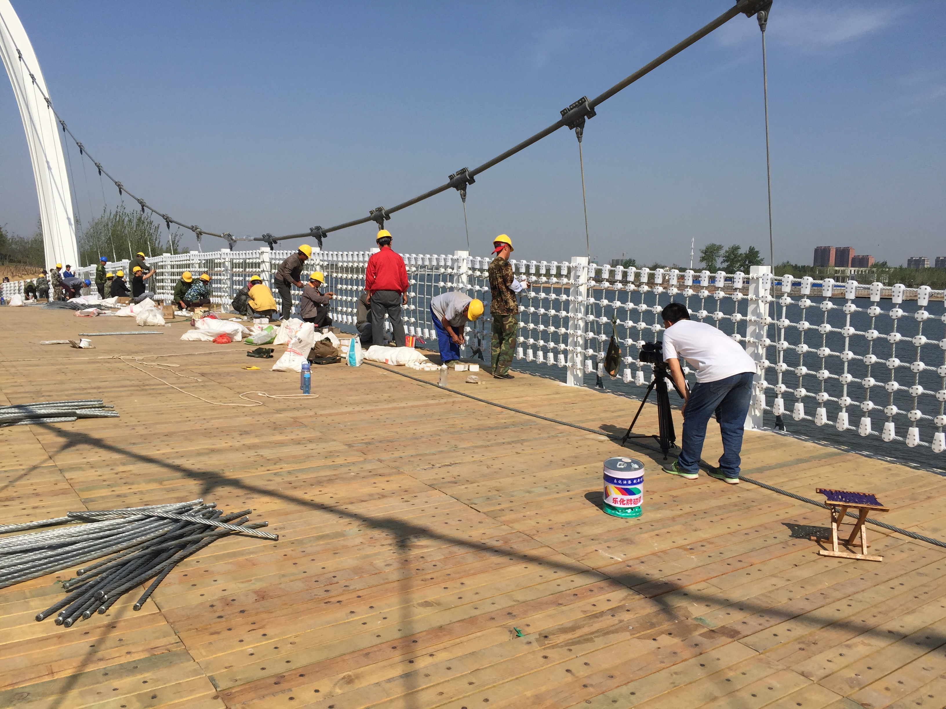 2017年5月9日,懸索橋防腐木鋪裝接近尾聲。