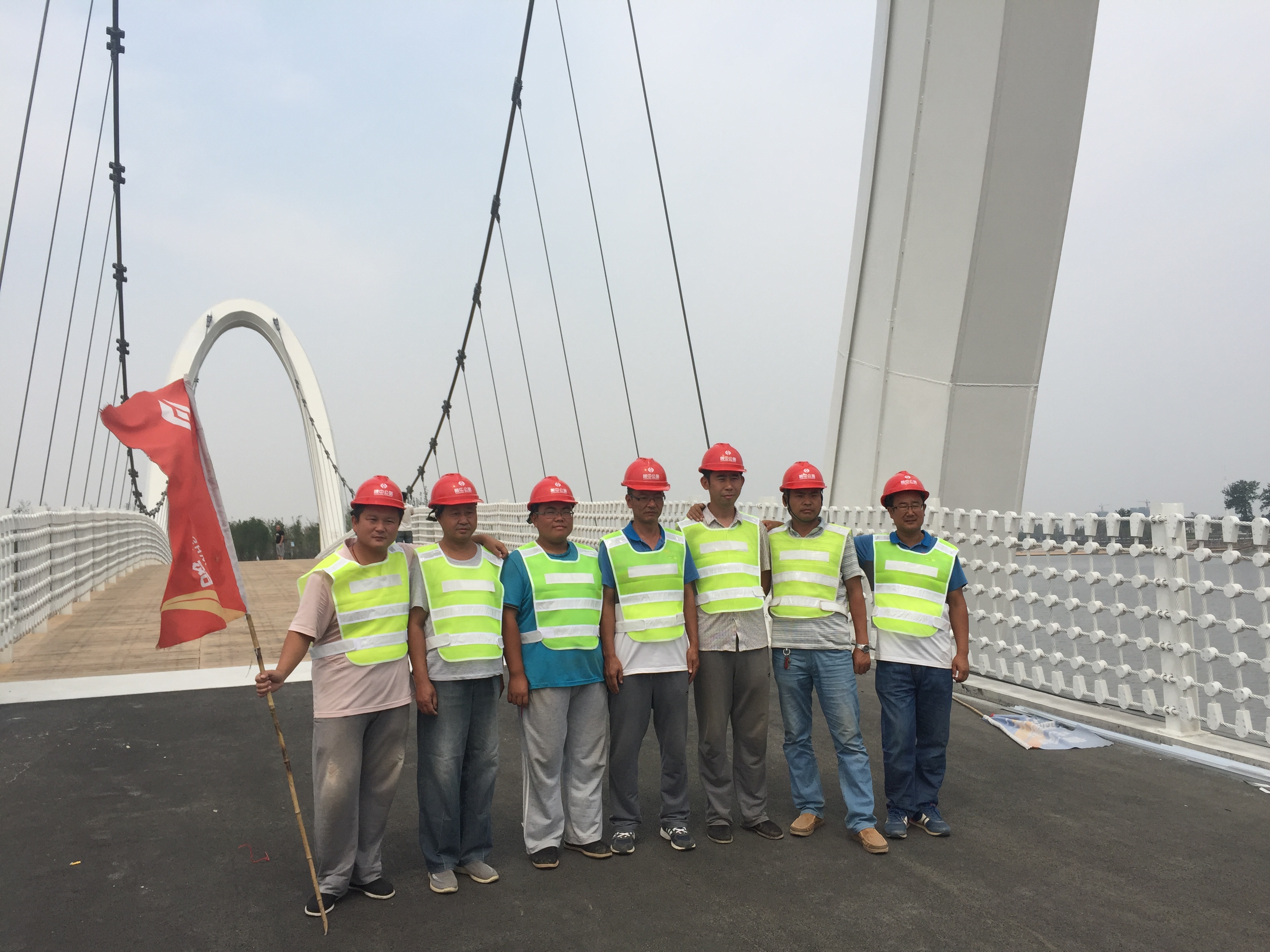 剛具雛形的大橋已經(jīng)美得惹人心醉,陽光下她白玉無瑕,夕陽中她粉魘如花,一根根鋼索,遠望去,猶如珠簾般令她更加搖曳生輝。隨著工序的進展,我們開始了橋面防腐木的鋪裝工作。1920條防腐木,護欄索30000多套不銹鋼螺絲,近6000個專門定制的異型PE件,全靠手工安裝、調整,懷揣著對懸索橋的那份執(zhí)著,大橋的建設者們采用人海戰(zhàn)術搶趕工期。近8個月的朝夕相伴,隨著護欄索的最后一道工序防銹噴漆作業(yè)的結束,懸索橋終于如期竣工了,人與橋互相見證了彼此的努力與成長,曾經(jīng)那一道道耀眼的電弧焊光,那一聲聲鋼撞鐵碰的聲響,那一車車混凝土的澆筑,成為了我們烙在心間的永恒記憶。
