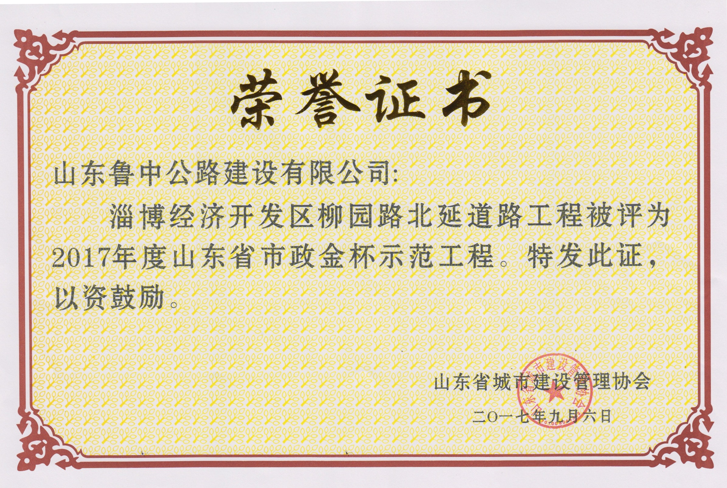 經(jīng)過(guò)5個(gè)月的奮斗,在公司領(lǐng)導(dǎo)、分公司領(lǐng)導(dǎo)的帶領(lǐng),項(xiàng)目部人員的共同努力下,作為公司首個(gè)市政工程----淄博經(jīng)開(kāi)區(qū)柳園路北延工程,在2016年8月份獲得了山東魯中公路建設(shè)有限公司“淄博市安全文明工地”的榮譽(yù)稱(chēng)號(hào),2016年12月份,獲得了山東魯中公路建設(shè)有限公司“淄博市市政金杯示范工程”的榮譽(yù)稱(chēng)號(hào),在2017年9月份,山東魯中公路建設(shè)有限公司獲得了首個(gè)“山東省市政金杯示范工程”榮譽(yù)稱(chēng)號(hào)。