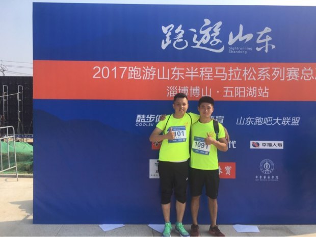 我們到達(dá)博山“五陽(yáng)湖”賽場(chǎng)時(shí)大霧還未散盡,在完成打印報(bào)名表、領(lǐng)服裝、別號(hào)牌、換統(tǒng)一的黃T恤等一系列的賽前準(zhǔn)備后,羅漢濤和王威智進(jìn)行了簡(jiǎn)單的熱身運(yùn)動(dòng)。