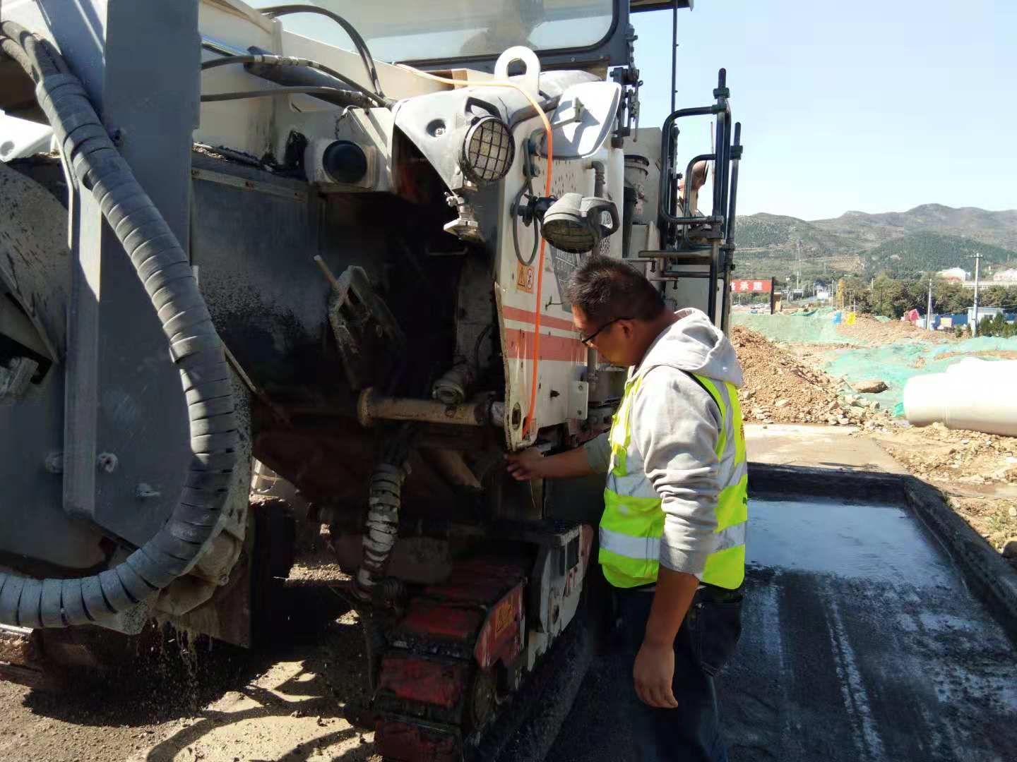 在人民路路面銑刨過(guò)程中,侯曉對(duì)銑刨機(jī)工作時(shí)所產(chǎn)生的大量煙塵問(wèn)題很是關(guān)心。他在工作之余查閱了大量資料,在充分了解了銑刨機(jī)工作的原理之后,結(jié)合自己的工作經(jīng)驗(yàn),畫(huà)出了一個(gè)簡(jiǎn)易的草圖,設(shè)計(jì)出了一款噴霧裝置,安裝到銑刨機(jī)上。經(jīng)過(guò)多次的實(shí)驗(yàn),效果非常好,大大減少了銑刨機(jī)在工作時(shí)的揚(yáng)塵。