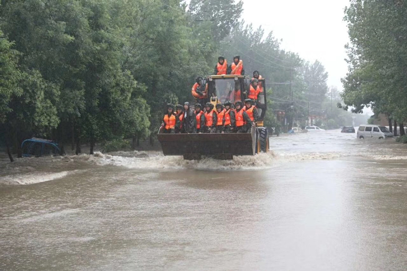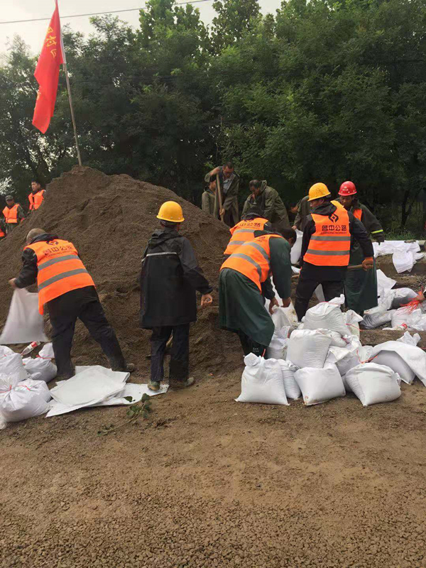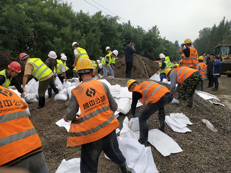 受“利奇馬”影響,8月10號到12號淄博市普降暴雨,孝婦河水位暴漲,袁家橋村段發(fā)生兩處50米、10米的決口,附近村莊被淹,情況危急。在項(xiàng)目自身受到臺風(fēng)與洪水影響的情況下,魯中公路經(jīng)開區(qū)分公司自8月11日17時開始,分批次投入搶險人員34人,搶險車輛7臺,冒雨投入到抗洪救災(zāi)搶險工作中。8月12日4時,魯中公路柳園路孝婦河橋項(xiàng)目部又組織11人救援小組與一臺裝載機(jī)雨中再次奔赴搶險救援現(xiàn)場。在省、市、開發(fā)區(qū)、及市交通運(yùn)輸局等領(lǐng)導(dǎo)的督導(dǎo)下,水利專家的指導(dǎo)下,魯中公路與500多名武警官兵、公安干警、消防戰(zhàn)士,及經(jīng)開區(qū)管委會、經(jīng)開區(qū)各施工單位,當(dāng)?shù)孛癖姷?000多人經(jīng)過兩天近50個小時的日夜奮戰(zhàn),8月13日下午16時,袁家橋段缺口成功堵住。