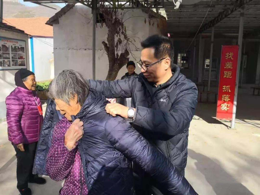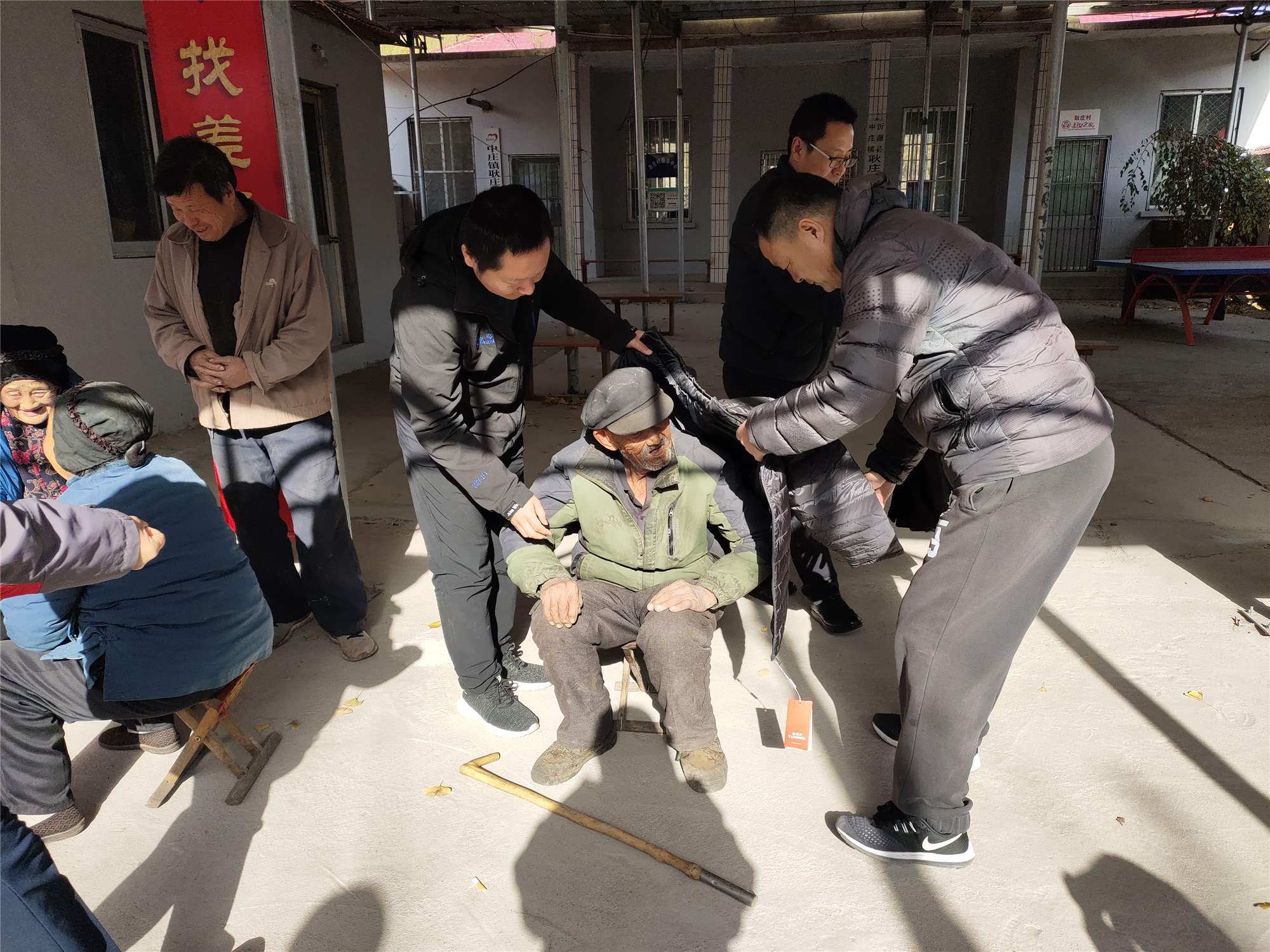 養(yǎng)護(hù)工程分公司黨支部書(shū)記黃衍剛、項(xiàng)目經(jīng)理王峰為村中最高壽(96歲)老人換上新衣