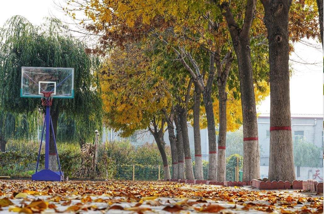 原來秋天的味道已經(jīng)飄滿了整個校園。一進校門映入眼簾的是一座三層橙色教學樓,兩邊甬路上的樹葉在冬季來臨之前還盡顯自己的“本色”,那有層次綠色,讓我感到一絲生命的力量。走到教學樓前往左看去,給人“一個像夏天一個像秋天”的感覺。欄桿外的槐樹上還掛著不少綠葉,欄桿里面的法桐已經(jīng)“黃金滿地”。走在諾大的橡膠操場上,一抬頭,一面鮮艷的五星紅旗在迎風飄揚,彰顯著祖國的威風。