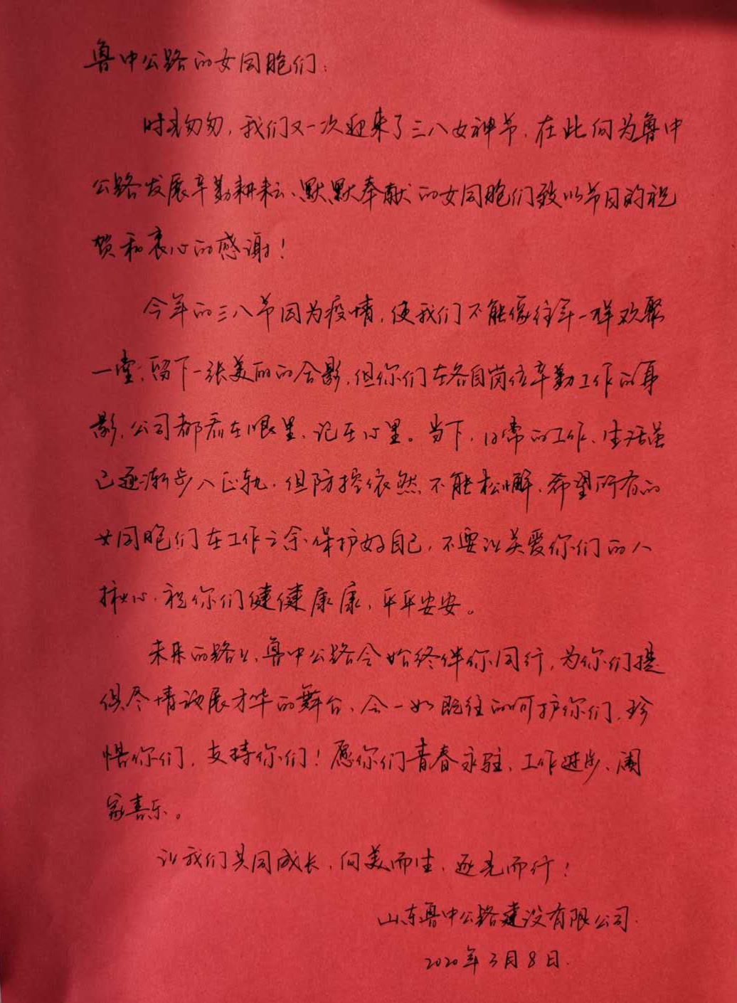 能加入公路人隊伍的女孩子,都是些勇氣可嘉、心有抱負(fù)的可愛姑娘,行業(yè)性質(zhì)決定了她們有木蘭一樣的決心和仗劍走天涯的灑脫。也因此,一年一度的“三八節(jié)”對魯中公路女員工來說,總是別有一番意義,每年這一天,大家會從各自的工地、崗位團聚到一起,嘮嘮工作趣談,看看彼此變化,聊聊未來愿望。今年,由于疫情原因,熱熱鬧鬧的聚會無法實現(xiàn),但公司早早的為全體女員工精心準(zhǔn)備了禮物與慰問信,向疫情期間仍在崗位上奮斗的女同胞們表示衷心感謝和節(jié)日的祝賀。