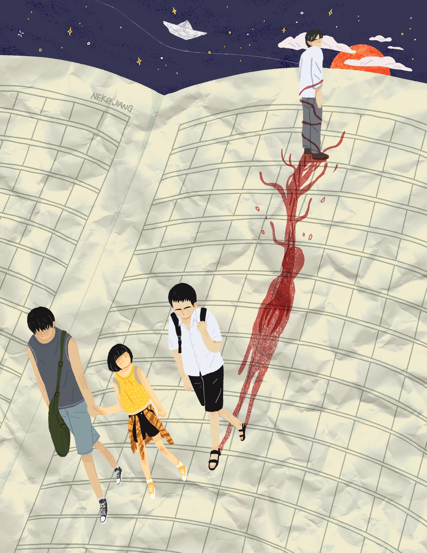 小說開篇即是張東升在妻子出軌決議離婚之后,在隱忍了一年,計劃了一年時,毫不猶豫的將自己的岳父母從山上推了下去。本來這會是一場完美犯罪,缺意外的被三個游玩的小孩子錄到了視頻中。朱朝陽本想報警,卻被普普阻止,她想勒索張東升,用勒索到的錢和丁浩成長到成年。在這時,朱朝陽還是一個規(guī)規(guī)矩矩的乖孩子,轉(zhuǎn)折點發(fā)生在意外殺死朱晶晶之后。為避免其他兩個人將他殺人的事情說出去,只能同意勒索之事,這是朱朝陽邁向黑暗的第一步,之后的事情更加不受控制:要挾張東升將自己父親和后媽殺害;為盡早繼承遺產(chǎn)挖出尸體的一角;在明知道張東升要殺死自己和伙伴三人時,袖手旁觀,最終獨自存活。推動所有事件的朱朝陽,卻在最后憑借一本“長高秘籍”和編造的日記本逃脫嫌疑,不得不敬佩這位少年的心智之高。