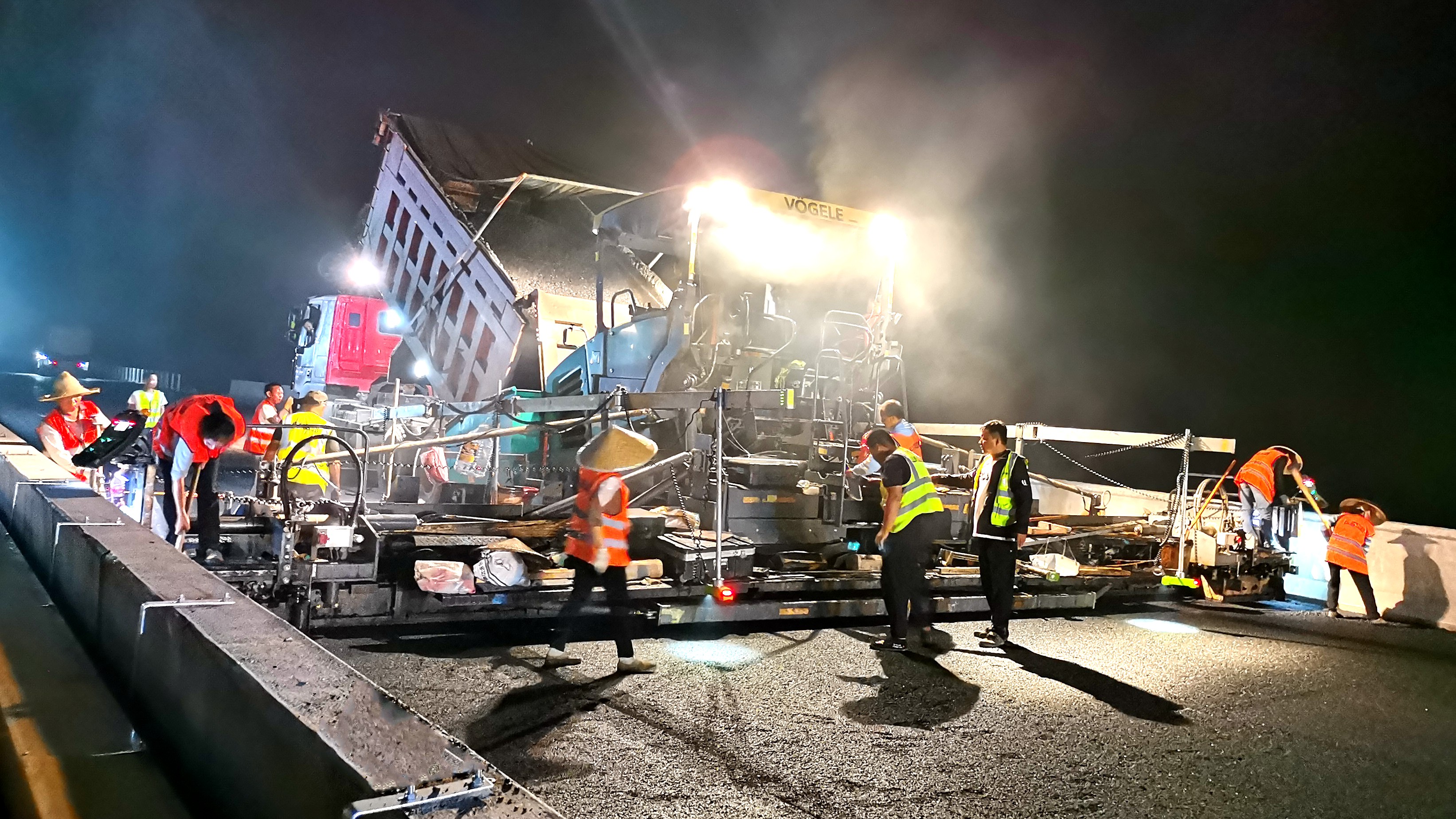 夜晚已來(lái)到凌晨,江西項(xiàng)目路面施工現(xiàn)場(chǎng)依舊燈火通明,攤鋪機(jī)、壓路機(jī)等施工機(jī)械轟鳴作響,一輛輛運(yùn)輸車輛來(lái)回穿梭,路面攤鋪工作緊鑼密鼓而又井然有序地進(jìn)行著。