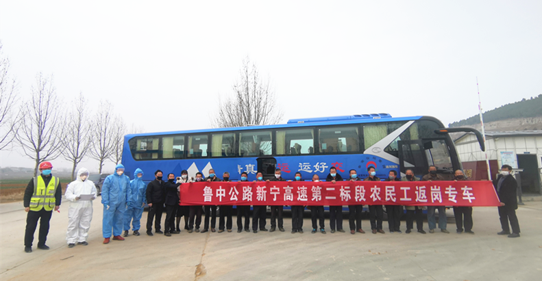 2020.02.26  張貼“魯中公路新寧高速第二標(biāo)段農(nóng)民工返崗專車”標(biāo)志的大巴車緩緩駛停二分部華豐鎮(zhèn)高莊預(yù)制場(chǎng)門前,標(biāo)志著新寧項(xiàng)目2020年攻堅(jiān)戰(zhàn)正式打響。