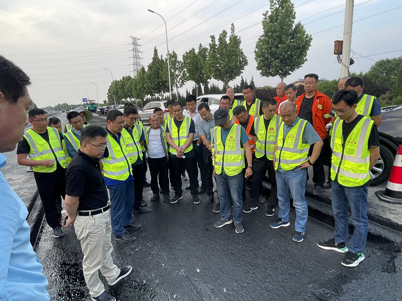 在現(xiàn)場會上,呂總針對當前項目施工中的重難點問題,同現(xiàn)場施工人員逐一進行了溝通交流,對路面銑刨,封層清掃、灑布,坑槽病害處理,瀝青攤鋪平整度、壓實度,橋梁伸縮縫施工等關鍵工序進行了技術交底,提出具體工作要求。勉勵大家必須盡快抓住關鍵矛盾,聚焦管理重點,有的放矢的做好項目管理和工作落實。