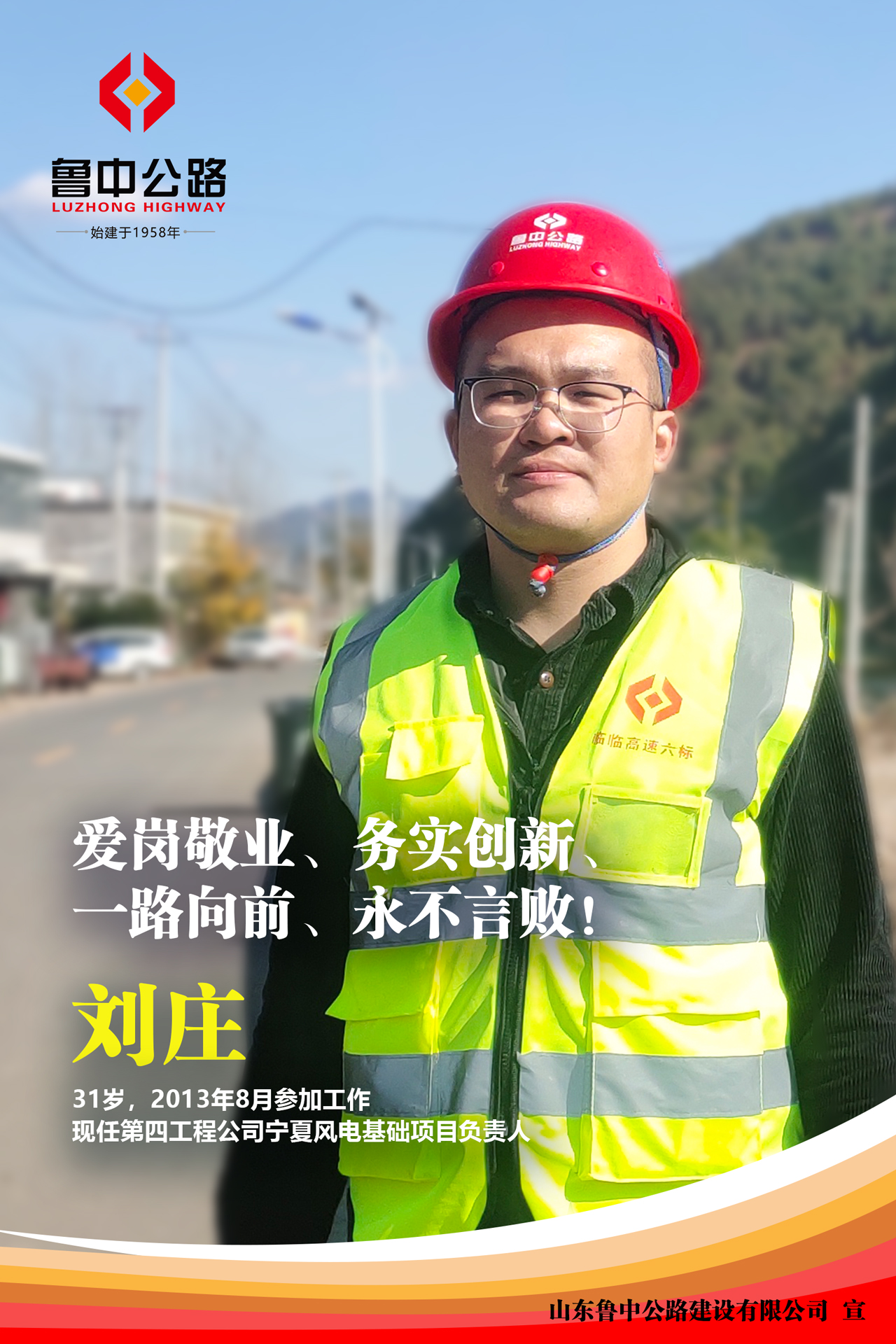 劉莊自參加工作以來(lái)一直駐守施工現(xiàn)場(chǎng)一線,從事現(xiàn)場(chǎng)施工工作。先后參加了長(zhǎng)雙高速、沂源危橋改造、S102張博路分離立交、南崔路分離立交、寧夏風(fēng)電等項(xiàng)目的建設(shè),現(xiàn)任寧夏風(fēng)電項(xiàng)目負(fù)責(zé)人。他的勤奮好學(xué)、踏實(shí)肯干,在工作上精益求精,有較高的理論水平和極強(qiáng)的學(xué)習(xí)能力,一直是公司的技術(shù)骨干。從青澀的學(xué)生到項(xiàng)目總工再到項(xiàng)目負(fù)責(zé)人的完美蛻變,歷經(jīng)八年,讓我們從他身上看到了閃光而集聚的正能量。