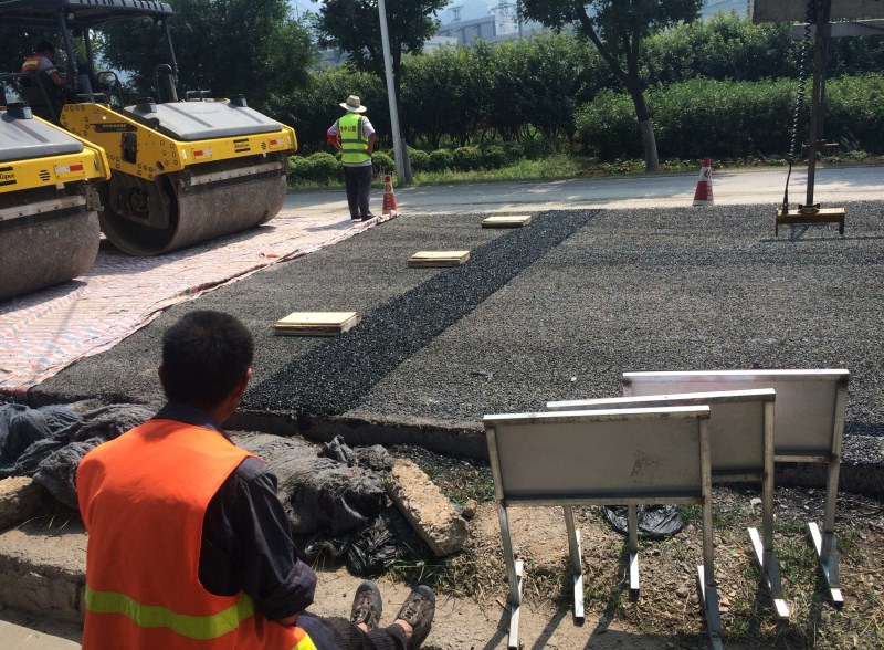 壓路機準備就位,接頭處鋪筑石屑以利于接頭。