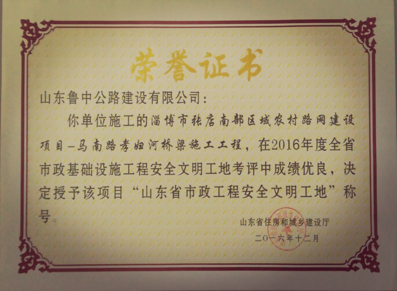 1月3日,經(jīng)確認(rèn),由我山東魯中公路建設(shè)有限公司承建的“淄博市張店南部區(qū)域農(nóng)村路網(wǎng)建設(shè)項(xiàng)目—馬南路孝婦河橋梁工程項(xiàng)目”被山東省住房和城鄉(xiāng)建設(shè)廳授予“山東省市政工程安全文明工地”榮譽(yù)稱號,在新年伊始便迎來了2017年的開門紅。