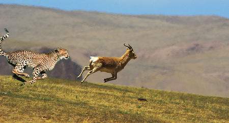 獵豹是短跑速度最快的動物,瞬間時速超過115公里。獵豹的主要食物是羚羊,奔跑速度很快,時速超過80公里,它們的聽覺也十分的靈敏,稍有風吹草動,它們頓時就會跑出百米之外,而且比獵豹的耐力更強,所以,如果獵豹發(fā)起攻擊時離跳羚太遠,跳羚就很有可能逃掉。