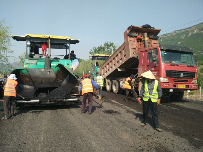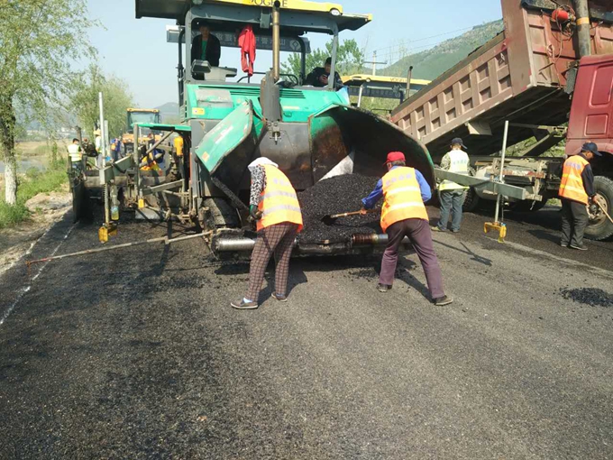 南崔路瀝青攤鋪施工現(xiàn)場,機械設備都在忙碌的工作中。