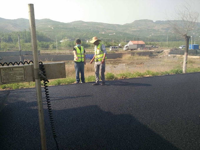 南崔路瀝青攤鋪現(xiàn)場,施工員焦守強跟機檢測。