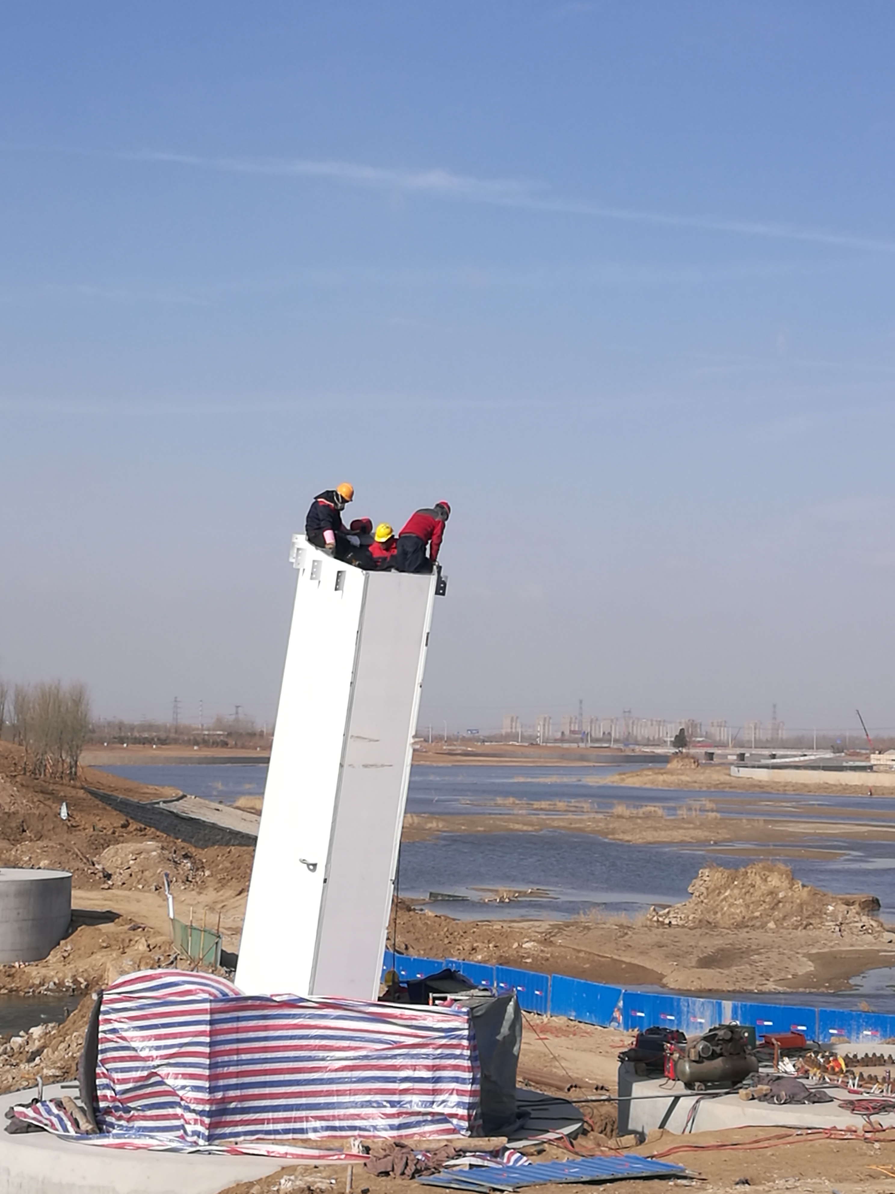 2017年2月20日,懸索橋第一節(jié)鋼主塔焊接,為保證焊接質(zhì)量,用尼龍彩條布做焊接擋風(fēng)處理。