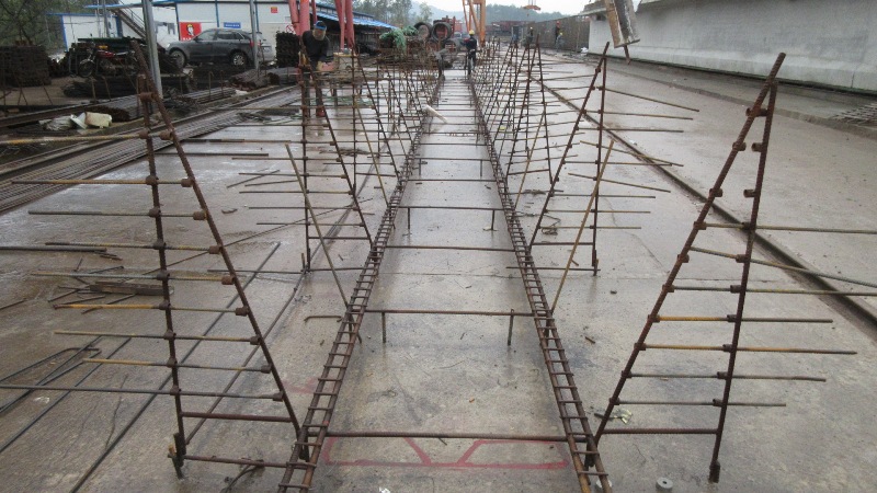 通過查閱圖紙,掌握整片箱梁鋼筋骨架的最外圍輪廓尺寸及每種類型鋼筋的型號、尺寸、間距、數(shù)量,做到心中有數(shù)。