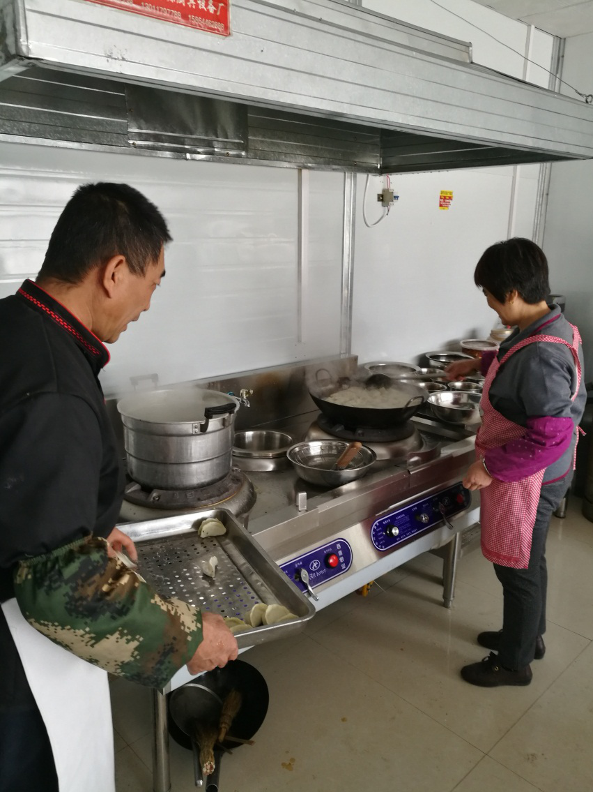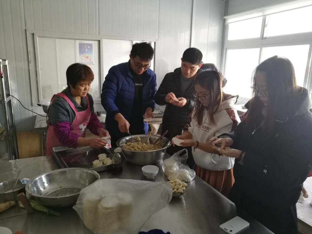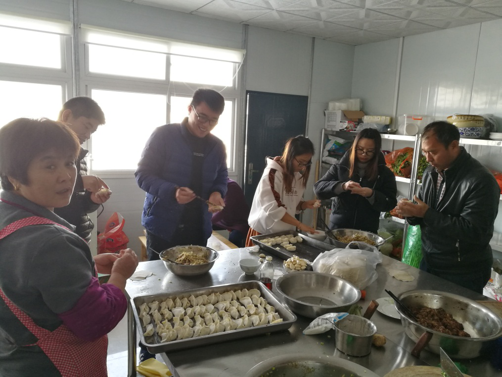 于是,出于為大家的耳朵著想以及滿足大家對餃子的渴望,今天上午,我們項(xiàng)目部決定中午吃餃子:一起動手包餃子、過冬至。雖然主題已經(jīng)定了,但是是關(guān)于吃什么餡的水餃可是大費(fèi)周折,有說蝦仁的、有說羊肉的、有說三鮮的、有說豆腐的……經(jīng)過一番激烈的討論,最終還是“諸肉還是豬肉好,百菜還是白菜香”的白菜肉餡和韭菜肉餡,從眾多候選中脫穎而出。負(fù)責(zé)項(xiàng)目食堂的廚師提前剁好了餃子餡,從市場上買來了餃子皮,我們大家就全副武裝上陣了。