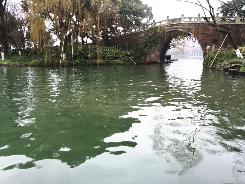 到了西湖,我們在導(dǎo)游的安排下,坐上一艘游船,去近距離探尋西湖的魅力之處。有人說,西湖美美在水上,的確,當(dāng)真正看清了西湖的水之后,才真正領(lǐng)會(huì)了這句話的含義。西湖的水,看上去是墨綠色的,像是綠色的紗裙,游船劃過,西湖像是活了一般,翩翩起舞,令人沉醉。沿著水面看向遠(yuǎn)處,又是那樣的平,如同明鏡,沒有一絲雜質(zhì),映照著這方純凈的天地。