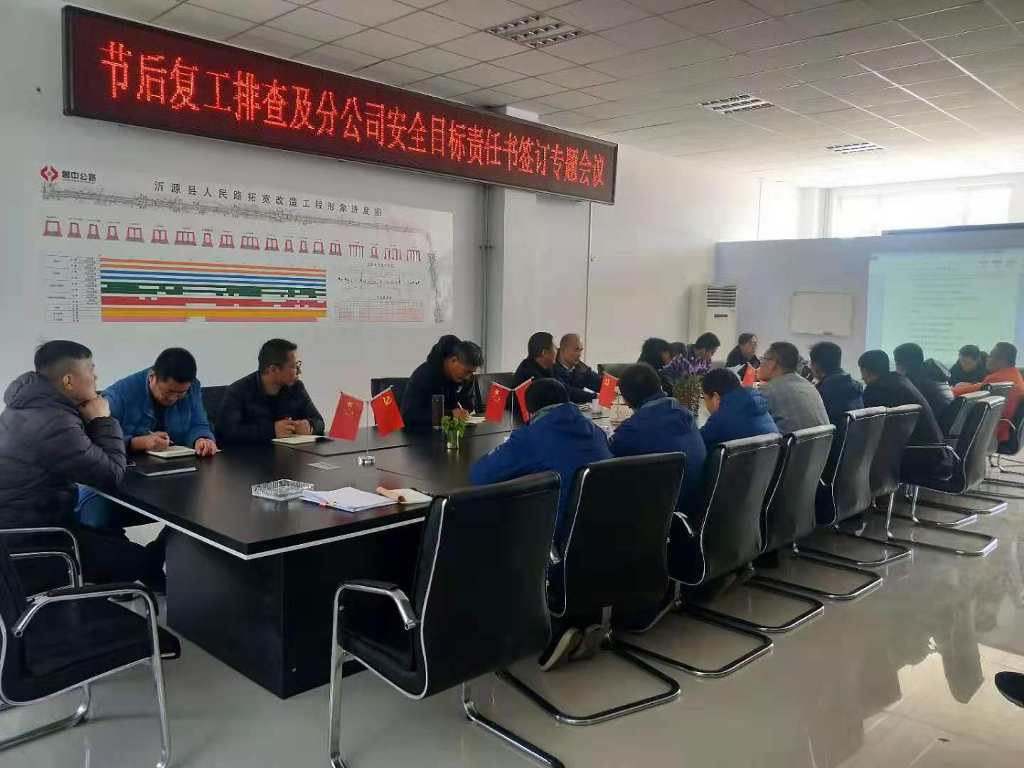 2019年3月7日公司工程管理部張忠民主席帶領(lǐng)質(zhì)量安全專家到養(yǎng)護(hù)分公司進(jìn)行節(jié)后復(fù)工排查及分公司安全目標(biāo)責(zé)任書簽訂專題會(huì)議。