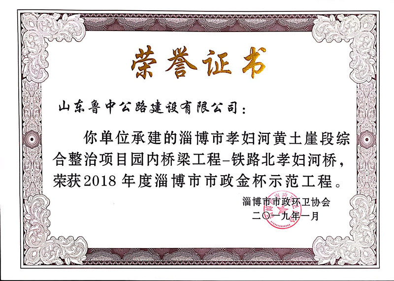 2019年1月,淄博市市政環(huán)衛(wèi)協(xié)會(huì)授予魯中公路承建的馬南路孝婦河橋梁工程、孝婦河懸索橋工程等四項(xiàng)工程市級“市政金杯示范工程”榮譽(yù)稱號