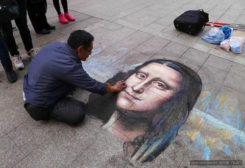 記得前幾天看到微信上的一篇推文,講述了“中國(guó)最牛乞丐”叢桂蘭的故事,可能他的事跡大家也是有所了解,一個(gè)破舊的行李包,一副拐杖,足以支撐他到處流浪35個(gè)年頭。16歲那年,他不幸得了骨腫瘤截肢,但命運(yùn)的不公并沒有泯滅他的夢(mèng)想,23歲那年他只身一人離開家鄉(xiāng),開啟了他的夢(mèng)想之路,起初雖懷著一顆熱愛繪畫的心,但因各種原因接觸到的專業(yè)知識(shí)少之又少,只能臨摹,在地上用粉筆畫一些簡(jiǎn)單的小狗小貓。他個(gè)人尤其熱愛達(dá)芬奇的畫作,剛開始是臨摹,后來(lái)回家以后開始研究蒙娜麗莎的傾斜度是怎樣的,頭到手是多大距離,后來(lái)經(jīng)過(guò)反復(fù)研究就將這些東西記在腦子里,到現(xiàn)在他已經(jīng)在地上畫過(guò)蒙娜麗莎800多次,長(zhǎng)2米左右,寬1.4米左右,反反復(fù)復(fù)用粉筆來(lái)回摩擦大概七八千次,差不多8個(gè)多小時(shí)才能完成,每次繪畫之前手上都要纏上厚厚的膠帶紙,雙手早已磨出了老繭,采訪時(shí)他說(shuō)道:“現(xiàn)在手上的老繭,即使是玻璃碴子扎一下也不會(huì)出血”。每次出攤畫畫的時(shí)候都會(huì)引來(lái)無(wú)數(shù)行人的圍觀,但是他對(duì)網(wǎng)友評(píng)價(jià)他是“中國(guó)最牛乞丐”并不是很適應(yīng),他說(shuō),乞丐是直接伸手去要,而我就是要憑本事吃飯,我不丟人也不卑微,我最大的夢(mèng)想就是去盧浮宮看蒙娜麗莎。