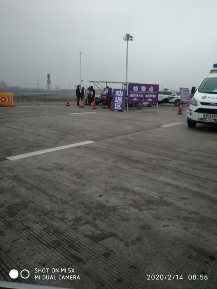 等待了一個小時二十分鐘后,看到業(yè)主拿著政府的批準文件跟防疫人員交涉。此后代理和業(yè)主帶領(lǐng)我們通過收費站,進入開標項目所在地域。圖片中標識牌上寫著外省車輛返回和本省車輛檢查方向指示??磥硗馐≤囕v直接返回,不讓通過。