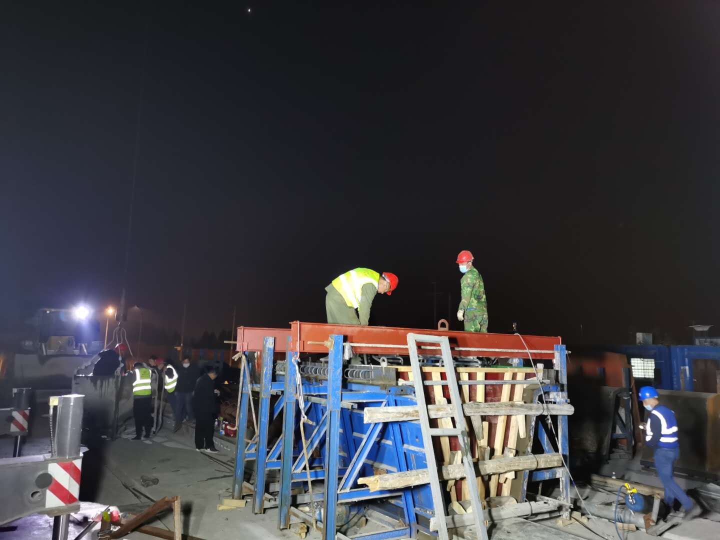3月22日下午我部主要負(fù)責(zé)人與總監(jiān)辦的監(jiān)理工程師及施工隊伍骨干就箱梁施工中混凝土配合比的控制、砼澆筑順序、箱梁底板砼的入模方式、附著式振動器的振頻開啟時間次數(shù)、怎樣保證鋼筋保護(hù)層厚度等做了討論并形成一致意見,3月22日晚上進(jìn)行了試驗梁的澆筑。試驗梁的澆筑完成為我部首片箱梁的預(yù)制提供了相關(guān)技術(shù)控制參數(shù)。
