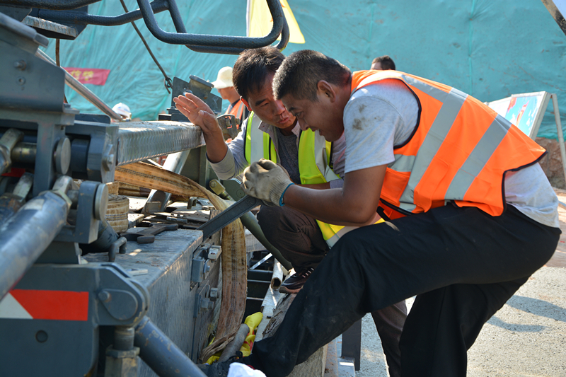 紅紅的安全帽穿行在機(jī)械之間