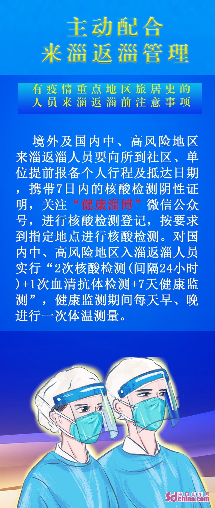 來淄返淄人員應(yīng)積極響應(yīng)疫情防控要求,境外及國內(nèi)中、高風(fēng)險地區(qū)來淄返淄人員須提前向所到社區(qū)(村居)和單位如實報告行程。攜帶7日內(nèi)核酸檢測陰性證明,關(guān)注“健康淄博”公眾號,進(jìn)行核酸檢測登記,并按要求到指定地點進(jìn)行核酸檢測。國內(nèi)中、高風(fēng)險地區(qū)來淄返淄人員務(wù)必做到“2次核酸檢測(間隔24小時)+1次血清抗體檢測+7天健康監(jiān)測”,健康監(jiān)測期間配合社區(qū)(村居)人員每天早、晚監(jiān)測一次體溫。