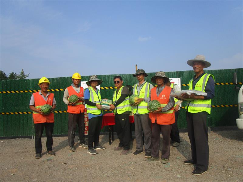 “講關(guān)懷、送清涼”小組人員從道路小樁號(hào)開始依次對(duì)路基、橋涵各分部送去藿香正氣水、郎秀礦泉水、綠豆、西瓜、工程項(xiàng)目施工人員安全指導(dǎo)手冊(cè)?;顒?dòng)過程中,小組人員與現(xiàn)場(chǎng)人員對(duì)工作環(huán)境、工作時(shí)間等進(jìn)行交流,橋涵一分部施工人員說道:“感謝項(xiàng)目部給一線工人送來的防暑降溫物品,送的是清涼,心里卻暖暖的”。
