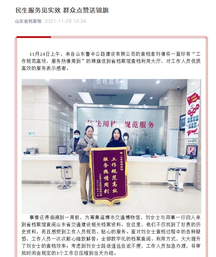 2021年11月29日,山東省檔案館公眾號推送了題為《民生服務見實效 群眾點贊送錦旗》的文章,講述了山東魯中公路建設有限公司為省檔案館送上錦旗的故事。