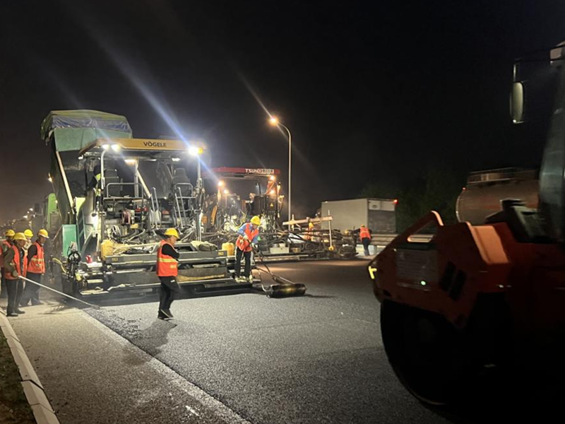 凌晨2:00,最后一車瀝青冒著熱氣攤鋪完畢。七個小時完成了1557米瀝青面層攤鋪,新鋪的路面在月光下泛著青黑色光澤。