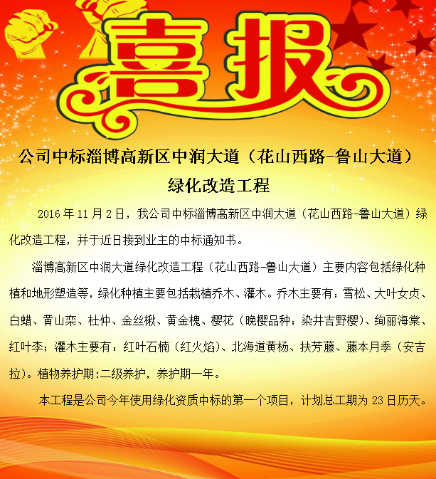 公司中標(biāo)淄博高新區(qū)中潤大道(花山西路-魯山大道)綠化改造工程